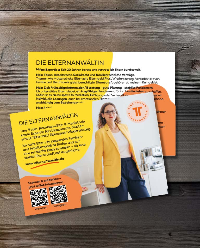 Tine Trojan ist Rechtsanwältin, Mediatorin und Expertin für Elternzeit und Elterngeld. Von der Website bis zur Postkarte: ein Auftritt, der vom ersten Moment an zeigt, für wen er gemacht ist – klar, direkt und nah an der Zielgruppe.
